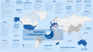 Map of KM3NeT cities and sites, including full member and observer institutes, with the three detector installation sites in the Mediterranean Sea: KM3NeT-Fr with the ORCA detector, KM3NeT-It with the ARCA detector and KM3NeT-Gr.