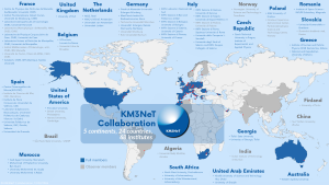 Map of KM3NeT cities and sites, including full member and observer institutes, with the three detector installation sites in the Mediterranean Sea: KM3NeT-Fr with the ORCA detector, KM3NeT-It with the ARCA detector and KM3NeT-Gr.
