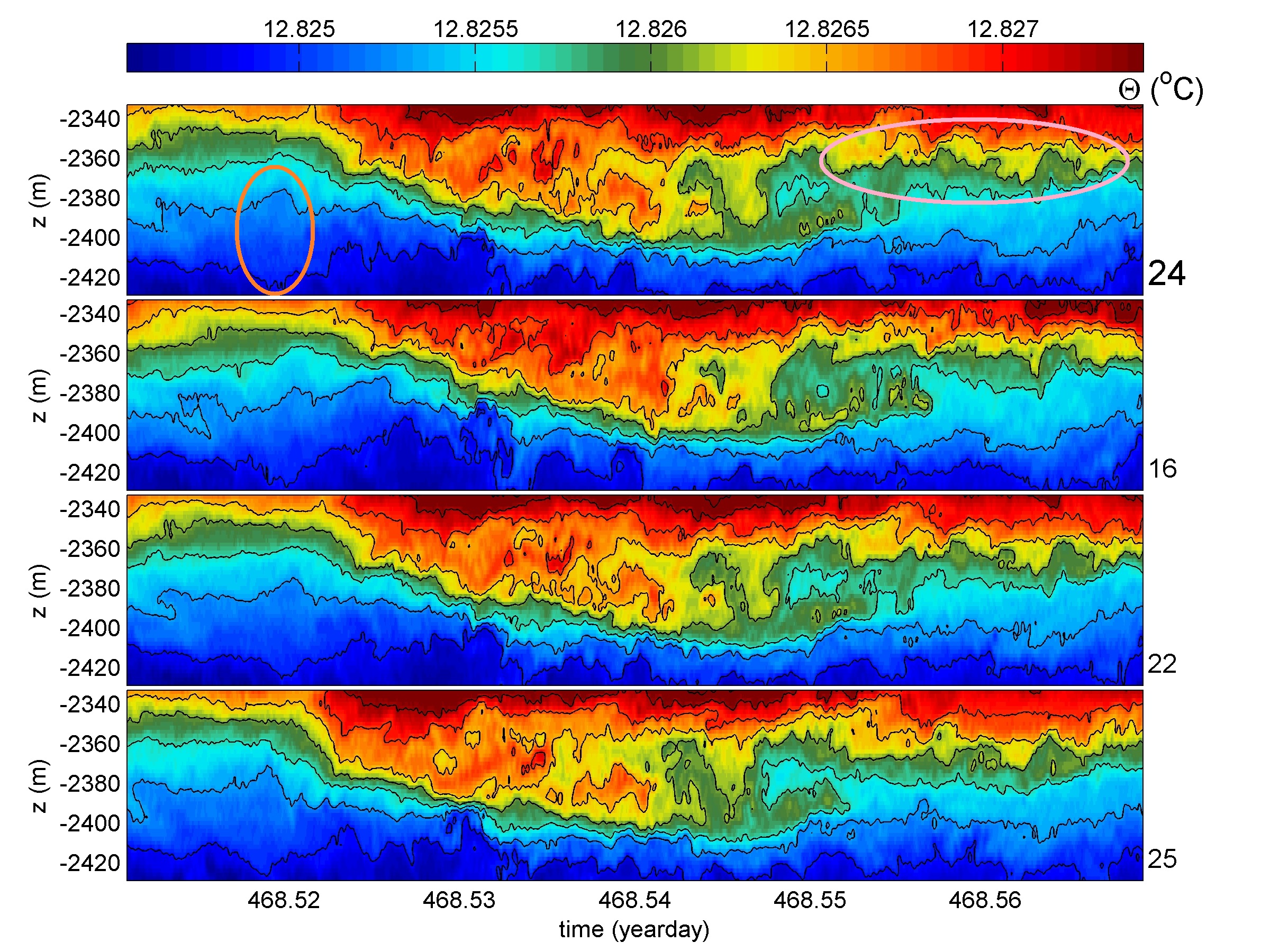 In the picture an example of a large breaker of warmer water including interfacial wave breakdowns recorded in four neighbouring lines of the array with temperature sensors. Vertical axes height of the sensors above the seafloor in meters; horizontal axis time of recording in days; colour coding indicating temperature of the water in degrees Celsius.