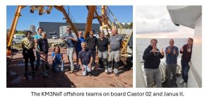 15 October 2025 – A very successful sea operation took place last week, leading to a significant extension of the ORCA submarine telescope. In about three days of operation in a very flat sea, five new detection units were installed in the deep sea and connected to the detector. In addition a set of four detection units already deployed in a previous campaign was connected to the second node of the submarine network, which was recently installed. Finally, a new tripod bearing an acoustic emitter to be used for positioning purposes was installed.