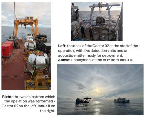 As usual, the operation was performed with two ships: the Castor 02 of Foselev, for deployment of the detection units, and the Janus II of SAAS (formerly Comex), equipped with the Apache deep-sea remotely operated vehicle (ROV), for submarine operations.
