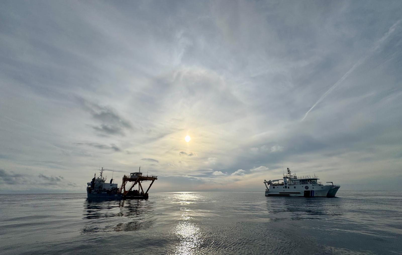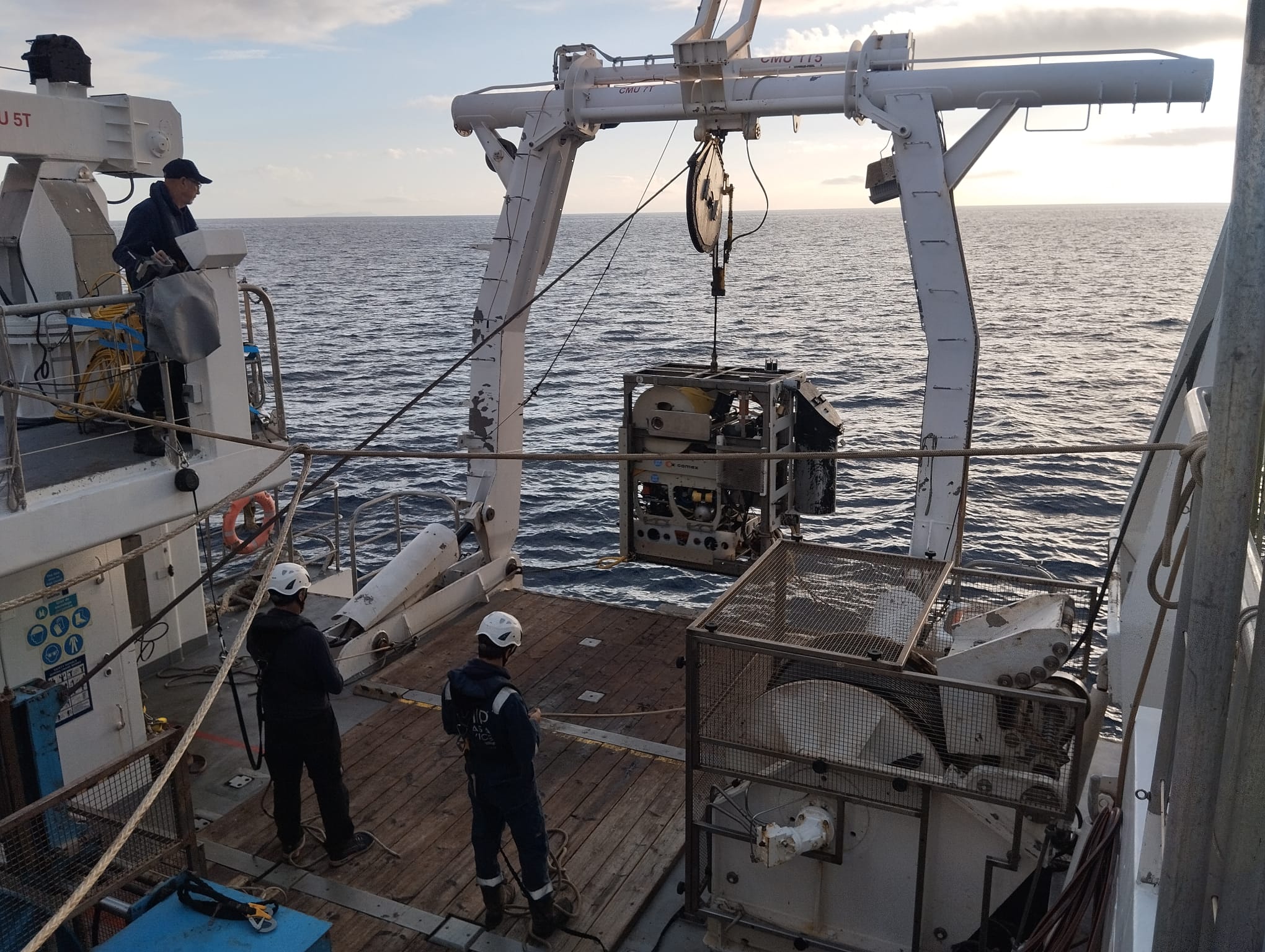 14 October 2025 – A very successful sea operation took place last week, leading to a significant extension of the ORCA submarine telescope. In about three days of operation in a very flat sea, five new detection units were installed in the deep sea and connected to the detector. In addition a set of four detection units already deployed in a previous campaign was connected to the second node of the submarine network, which was recently installed. Finally, a new tripod bearing an acoustic emitter to be used for positioning purposes was installed.